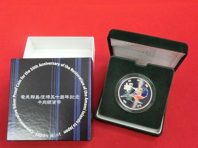 -----------------------商品説明-----------------------◇商品 2015 奄美群島復帰50周年記念 (平成27年) ◇詳細 額面価格 : 1,000円 発行数 : 50,000セット 図柄(表) : ルリカケスとテッポウユリ 図柄(裏) : 奄美群島 素材 : 銀 品位 : 純銀 量目 : 31.1グラム 直径 : 40mm ◇状態 パッと見で綺麗なお品ですが、経年劣化による擦れ傷、ヤケ、シミが多少ある場合があります。 (写真は見本です。実際に発送するものとは異なる場合がございますが、同等品程度の品物を発送します。) ※商品写真はできる限り実物の色に近づけるようしておりますが、 お使いのモニター設定、お部屋の照明等により実際の商品と色味が異なる場合がございます。 ◇ 奄美群島復帰とは 戦後、沖縄同様に米軍統治下に置かれた奄美群島は、8年間の米軍政下を経て1953年(昭和28)12月24日に日米間で奄美群島返還協定が調印され、翌25日、日本に復帰しました。 ◇記念貨幣(きねんかへい)とは 世界各国で国家的な出来事を記念して発行される貨幣であるが、特に出来事を記念しなくても、シリーズ貨幣として文化遺産や野生動物等を主題とするものもある。多くが硬貨だが、紙幣で発行される場合もある。記念通貨(きねんつうか)ともいい、特に硬貨の場合は記念硬貨、記念コイン、紙幣の場合は記念紙幣ともいう。 ●歴史 記念貨幣を最初に発行した国家はローマ帝国である。ローマ帝国では戦勝記念の貨幣を度々発行しており、従属することになった被征服者を象徴的に表すことでローマの権威を誇示するプロパガンダの目的があった。また貨幣には多くの場合皇帝や国王の肖像が刻まれていたが、新しく即位した君主を記念する貨幣が発行されることがあり、それは近世になると多くなった。すなわち新しい君主の肖像を宣伝する意味もあった。 貨幣には通常の流通を目的とする通常貨幣とよばれるものがあるが、近年ではアメリカ合衆国の50州25セント硬貨のように通常貨幣とは異なるデザインの硬貨を通常貨幣と同様に流通させる場合もあり、これも記念貨幣とされる。またイギリスの5ポンド硬貨やユーロ圏諸国の2ユーロ記念硬貨のように、毎年記念貨幣として発行される額面がある。なお5ポンドは通常貨幣は紙幣であり、硬貨は記念貨幣のみである。 第二次世界大戦頃までの高額硬貨は、本位貨幣として金貨や銀貨など、貴金属で作られることが多く、そのため多くの記念貨幣も貴金属で作られていた。しかし世界恐慌後に世界各国で金本位制が停止したため、通常貨幣として金貨が発行されることは、ほとんどなくなり、第二次世界大戦後は記念貨幣も廉価な銅貨や白銅貨で製作されることが多くなった。更に1970年以降は銀の工業需要増大による価格が上昇したため、銀貨を通常貨幣として流通させる国も無くなった。このため現在では、記念貨幣のみが貴金属で発行される状況となった。貴金属の素材は金、銀が中心だが、プラチナやパラジウムなどが使用されたものも存在する。 記念貨幣も法貨であるので原則的に通用額面が表記されているが、収集型金貨のように、額面よりもはるかに高額な素材を使用し、また額面よりも高く販売される場合もある。また地金型金貨においても、額面で取引されるのではなく、実際には地金に製造費を上乗せした価格で販売されている。中には、毎年デザインを変えて発行されるもの(アメリカ合衆国のウォーキングリバティなど)もあり、これらも記念貨幣の一種と見なされる。 ●発行理由 ヨーロッパの王国では、王室の慶事で記念貨幣が発行されることが多い。国王の即位および戴冠式、国王や皇太子の婚儀、国王夫妻の銀婚式や金婚式、国王の長期間の統治などが主な事由である。 世界で最初にオリンピック開催を記念した銀貨を発行したのはフィンランドのヘルシンキ大会であった。額面は500マルッカで1951年と1952年の年号銘があり、直径32ミリメートルで重量が12グラムであったが、銀比率が.500の低品位銀貨であった。1964年には日本で東京オリンピックの記念銀貨が発行され、人気が高まり発行による収益を大会運営費に当てるに至った。この成功をきっかけにその後1968年のメキシコオリンピックでも記念銀貨を多量に発行し、以降オリンピック大会開催毎に記念貨幣を発行し、その収益を大会運営費に当てることが定着した。 アメリカ合衆国では、1ドルと50セントの記念銀貨、5ドルや10ドルの記念金貨などを多く発行している。1976年の建国200年記念では通常貨のデザインを変更した1ドル、50セント、25セントの記念貨幣を発行したほか、偉人の生誕周年記念などの貨幣が見られる。なおアメリカの記念金貨は収集型金貨であり、たとえば5ドル金貨(重量8.39グラム、品位.900)は、一般への売り出し価格は200ドルであり、法定通貨としての額面よりも多額のプレミア価格が付けられている。 一般的にオリンピックやサッカーのワールドカップ、万国博覧会では開催国から記念貨幣が発行されることが通例となっているが、開催国以外