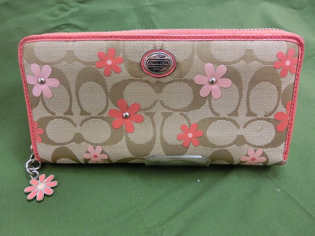 【良品】コーチ 長財布 財布 花柄 ベージュ ピンク レディース
