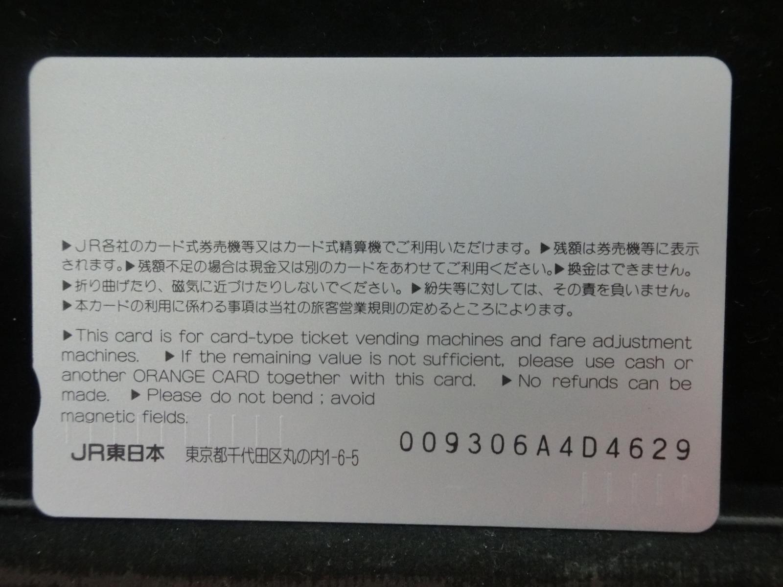 -----------------------商品説明-----------------------■品物 オレンジカード 未使用 ■額面 1000円 ■状態 画像をご確認ください。 ■在庫 在庫については、店舗販売もしておりますので、 ご注文頂いた全てをご用意できない場合もございます。 カートに在庫がない場合にもお問い合わせいただければご相談をお受けいたします。 ■オレンジカードとは JR各社で利用できる磁気式プリペイドカードである。略称でオレカとも呼ばれる。 日本国有鉄道(国鉄)時代の1985年3月25日に関東圏の主要駅で販売が開始されたのち、 全国で発売された。2013年3月31日限りで発売を終了した。 ◎概要 1971年(昭和46年)に研究と開発を開始。マルス105開発や国鉄経営難等もあって開発は数回中断している。 1984年(昭和59年)、JNRカードの開発と同時期に再度開発をスタート。 当時からICカード化にも意欲を見せていたが、この時は断念している。 開発プロジェクトのリーダーは、当初から須田寬(後に常務理事を経てJR東海の初代社長)が担当している。 オレンジカード対応の自動券売機で乗車券(切符)類の購入に利用できる。 また、オレンジカード対応の自動精算機や有人改札の窓口処理機で乗り越し精算にも利用できる。 もっとも、イオカード・Jスルーカード・ワイワイカード(以上いずれも発売終了)のように、 自動改札機に直接投入して自動精算することはできない。 JRの駅のみどりの窓口やカード発売機のほか、一部のデパートで購入することができた。 また、JRの一部特急列車でもオレンジカード発売の案内放送があれば車掌から購入することが可能で、 その中には車内販売限定オリジナルデザインのものもあった。 新幹線のみが停車する山陽新幹線の新神戸駅、北陸新幹線の安中榛名駅や 東北新幹線のいわて沼宮内駅・二戸駅・八戸駅・七戸十和田駅・東海道新幹線の新富士駅、 在来線の無人駅およびみどりの窓口非設置駅では、オレンジカード対応の自動券売機が設置されていないため、 オレンジカードを使用しての乗車券類の購入はできない。 ただし、新幹線のみが停車する軽井沢駅・上田駅・上毛高原駅や、一部のみどりの窓口非設置駅などでは、 オレンジカード対応の自動券売機が設置されている場合がある。 無人駅が多い鶴見線や青梅線の各駅にもオレンジカード対応の自動券売機が設置されていたが、 鶴見線は鶴見駅を除く全駅が2022年2月28日に、 青梅線は一部の駅を除き2017年から2018年にかけて自動券売機が撤去され、利用ができなくなった。 みどりの窓口設置駅でありながら他社管理駅である小諸駅(しなの鉄道管理駅)、 八戸駅(在来線は青い森鉄道管理駅)と自動券売機非設置の左沢駅などでは使用することができない。 オレンジカードで購入した乗車券類は、みどりの窓口[注 2]で乗車変更の取り扱いが可能である。 他の乗車カード類の場合も共通するが、 オレンジカードで他のオレンジカードや他のJRの磁気式乗車カード(イオカード)などを購入したり、 Suica・ICOCA・TOICA・Kitaca・SUGOCAのJRの 非接触型ICカードを購入したりチャージ(現金積み増し)したりすることはできない。 また車内精算で使用することもできない。 以前はクレジットカードでの購入も可能だったが、北海道旅客鉄道(JR北海道)では2003年6月20日から、 東日本旅客鉄道(JR東日本)では2005年ごろから(ビューカードは最後まで購入可能だった)、 JR九州、JR四国、JR西日本も段階的に購入が不可能となった。 これは、クレジットカードを盗んだ者がオレンジカードを購入、 金券ショップで換金することで現金を得るという不正行為を行っており、これを防ぐことが目的であった。 ◎発売終了 JR東日本の首都圏エリアでは1991年3月1日にイオカードが発売開始され、 そして2001年11月18日にSuicaの販売を開始した。 これらのカードは自動券売機で乗車券に引き換えることなくカード自体に対して 自動改札機による改札処理を行うことが可能でありオレンジカードに代わり普及し、 JR東日本ではオレンジカードの売上はピーク時の1991年には327億円あったが、 2006年には13億円に減少した。 また他のJR各社も1990年代以降、自社独自の磁気式ストアードフェアカードやICカードを発売開始している。 JR西日本(西日本旅客鉄道)では、新幹線単独駅に設置されている一部の券売機を除いてオレンジカードが使用可能であり、 在来線扱いの博多南線博多南駅でも使用できる。 ICOCA・Jスルーエリアの小規模の駅で取扱いをやめている。 一部の駅の出札窓口でも専用の処理機を使う事で利用することができた時期もある。 ただし、一部の駅ではオレンジカード対応券売機が設置されていない。 このため、オレンジカード対応の自動券売機が更新されないケースや、 オレンジカードを発売していない駅も出てきている。 しかし、当時ICOCAの導入予定を公式発表していなかった北陸地方と山口県内や山陰地方では、 2008年頃まで記念カードも発行されていた。 また、2011年頃でも、JR北海道[注 3]とJR四国[