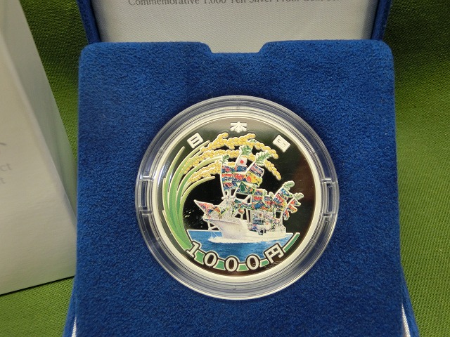 -----------------------商品説明-----------------------■品物 東日本大震災復興事業記念 第一次 ■発行年 平成27年 ■素材 純銀 ■デザイン 表 大漁船と稲穂 裏 奇跡の一本松とハト ■重さ 31.1g ■直径 40mm ■額面 1,000円 ■付属品 写真の物が全てです。 ■発行枚数 60,000枚 ■状態 写真をご確認ください。 ■在庫 在庫については、店舗販売もしておりますので、 ご注文頂いた全てをご用意できない場合もございます。 ※カートに在庫がない場合にもお問い合わせいただければご相談をお受けいたします。 ■記念貨幣(きねんかへい)とは 世界各国で国家的な出来事を記念して発行される貨幣であるが、特に出来事を記念しなくても、 シリーズ貨幣として文化遺産や野生動物等を主題とするものもある。 多くが硬貨だが、紙幣で発行される場合もある。記念通貨(きねんつうか)ともいい、 特に硬貨の場合は記念硬貨、記念コイン、紙幣の場合は記念紙幣ともいう。 ◎歴史 記念貨幣を最初に発行した国家はローマ帝国である。 ローマ帝国では戦勝記念の貨幣を度々発行しており、 従属することになった被征服者を象徴的に表すことでローマの権威を誇示するプロパガンダの目的があった。 また貨幣には多くの場合皇帝や国王の肖像が刻まれていたが、 新しく即位した君主を記念する貨幣が発行されることがあり、それは近世になると多くなった。 すなわち新しい君主の肖像を宣伝する意味もあった。 貨幣には通常の流通を目的とする通常貨幣とよばれるものがあるが、 近年ではアメリカ合衆国の50州25セント硬貨のように通常貨幣とは異なるデザインの硬貨を通常貨幣と同様に流通させる場合もあり、 これも記念貨幣とされる。 またイギリスの5ポンド硬貨やユーロ圏諸国の2ユーロ記念硬貨のように、毎年記念貨幣として発行される額面がある。 なお5ポンドは通常貨幣は紙幣であり、硬貨は記念貨幣のみである。 第二次世界大戦頃までの高額硬貨は、本位貨幣として金貨や銀貨など、貴金属で作られることが多く、 そのため多くの記念貨幣も貴金属で作られていた。 しかし世界恐慌後に世界各国で金本位制が停止したため、通常貨幣として金貨が発行されることは、ほとんどなくなり、 第二次世界大戦後は記念貨幣も廉価な銅貨や白銅貨で製作されることが多くなった。 更に1970年以降は銀の工業需要増大による価格が上昇したため、銀貨を通常貨幣として流通させる国も無くなった。 このため現在では、記念貨幣のみが貴金属で発行される状況となった。 貴金属の素材は金、銀が中心だが、プラチナやパラジウムなどが使用されたものも存在する。 記念貨幣も法貨であるので原則的に通用額面が表記されているが、収集型金貨のように、額面よりもはるかに高額な素材を使用し、 額面よりも高く販売される場合もある。 また地金型金貨においても、額面で取引されるのではなく、実際には地金に製造費を上乗せした価格で販売されている。 中には、毎年デザインを変えて発行されるもの(アメリカ合衆国のウォーキングリバティなど)もあり、これらも記念貨幣の一種と見なされる。 ◎発行理由 ヨーロッパの王国では、王室の慶事で記念貨幣が発行されることが多い。 国王の即位および戴冠式、国王や皇太子の婚儀、国王夫妻の銀婚式や金婚式、国王の長期間の統治などが主な事由である。 世界で最初にオリンピック開催を記念した銀貨を発行したのはフィンランドのヘルシンキ大会であった。 額面は500マルッカで1951年と1952年の年号銘があり、直径32ミリメートルで重量が12グラムであったが、 銀比率が.500の低品位銀貨であった。1964年には日本で東京オリンピックの記念銀貨が発行され、 人気が高まり発行による収益を大会運営費に当てるに至った。 この成功をきっかけにその後1968年のメキシコオリンピックでも記念銀貨を多量に発行し、 以降オリンピック大会開催毎に記念貨幣を発行し、その収益を大会運営費に当てることが定着した。 アメリカ合衆国では、1ドルと50セントの記念銀貨、5ドルや10ドルの記念金貨などを多く発行している。 1976年の建国200年記念では通常貨のデザインを変更した1ドル、50セント、25セントの記念貨幣を発行したほか、 偉人の生誕周年記念などの貨幣が見られる。なおアメリカの記念金貨は収集型金貨であり、 たとえば5ドル金貨(重量8.39グラム、品位.900)は、一般への売り出し価格は200ドルであり、 法定通貨としての額面よりも多額のプレミア価格が付けられている。 一般的にオリンピックやサッカーのワールドカップ、 万国博覧会では開催国から記念貨幣が発行されることが通例となっているが、 開催国以外の、場合によってはそのイベントに参加しない国までがコレクター目当てで便乗してこれらのイベントの記念貨幣を発行する場合もあり、 記念切手もしくは特殊切手と同じような現象も生じている。 また自国にはいない野生生物や外国の世界遺産を紹介するとして記念貨幣を発行されることも