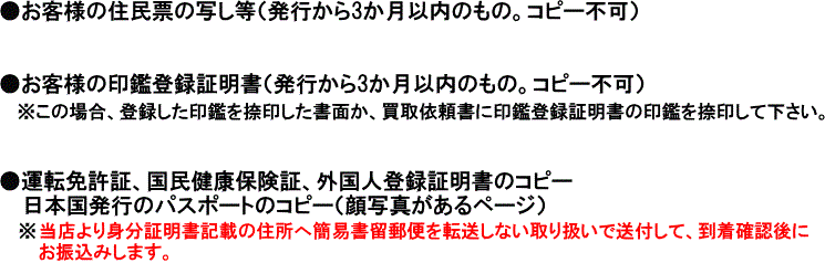 現住所の記載がある公的身分証明書をご用意ください。(※古物営業法に基づき、必要書類となります。同封されていない場合、お買取りができません)