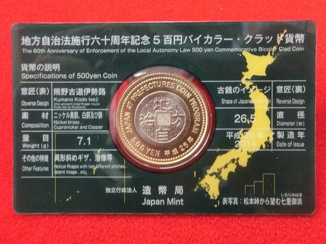 -----------------------商品説明-----------------------■商品 三重県 Aセット 500円 貨幣セット 地方自治施行 バイカラー・クラッド貨幣 ■図柄 〈表〉熊野古道伊勢路 〈裏〉古銭のイメージ ■発行年 平成26年 ■発行数 114,000セット (Bセット、Cセット含む) ■素材 ニッケル黄銅、白銅及び銅 ■品位 銅750 亜鉛125 ニッケル125 ■量目 7.1g ■直径 26.5mm ■状態 パッと見で綺麗なお品ですが、経年劣化による擦れ傷、ヤケ、シミが多少ある場合があります。 (写真は見本です。実際に発送するものとは異なる場合がございますが、同等品程度の品物を発送します。) ※商品写真はできる限り実物の色に近づけるようしておりますが、 お使いのモニター設定、 お部屋の照明等により実際の商品と色味が異なる場合がございます。 ■地方自治法施行60周年記念貨幣とは 日本において地方自治法施行60周年を記念して発行された記念貨幣です。 1947年(昭和22年)5月3日に施行された地方自治法が60周年を迎えたことを記念し、 2008年(平成20年)以降、47都道府県の図柄を あしらった500円バイカラー・クラッド貨と1000円銀貨を順次発行することが発表された。 これはアメリカ合衆国の50州の図柄をあしらっ た25セント硬貨と類似の企画で、 約10年をかけて毎年数県ずつの硬貨を発行された。 このシリーズは47件94種類と日本の記念貨幣最多のものとなった。 1000円銀貨は都道府県をあしらった図案を採用し、艶消しのプルーフ仕上げを行った上、 彩色されたカラーコインで発行されている。 また額面以上の価格で配布されるプレミアム型貨幣であり、 造幣局に事前に申し込みをした希望者から抽選で購入者を決定して 代金と引換で発送する方法(販売価格には発送費用及び消費税も含まれている)が取られているが、 題材として取り上げられた都道府県の住民には全国よりも2倍の確率で当選できるようになっている。 500円バイカラー・クラッド貨は、額面で金融機関において引き換えがされた。 これとは別に、500円バイカラー・クラッドプルーフ貨は、1000円銀貨同様、発売価格が額面を上回っており、 造幣局に事前申し込みによる抽選により購入者が決定される(通常の貨幣も造幣局で発売されたが、 送料やケースの費用などから額面の倍の価格で発売された)。 なお、額面で交換する500円バイカラー・クラッド貨も同様に 題材として取り上げられた都道府県分の引き換え枚数が他の都道府県より多く割り当てられている。 日本郵政もこの記念貨幣シリーズとの共同企画として、 各都道府県を題材とした80円の記念切手5種類を収めた小型シートを発行した。 この小型シートのデザインのうち1種類は記念貨幣と題材が同じであり図案もほぼ同じで、 他の4種類は対象都道府県の観光地などがデザインされている。 この記念切手をケース入りの記念貨幣と共に特製ケースに組み込んだ貨幣セットが造幣局で販売され、 ケースに貨幣が収められた単体のAセット、Aセット+記念切手入り特製ケースのBセット、 Aセット+記念切手が入っていない特製ケースのCセットの3種類が 500円バイカラー・クラッド貨と1000円銀貨でそれぞれ発売された。 ■偽造防止技術 1000円銀貨 貨幣側面に斜めギザが入っている、 貨幣の模様の圧印と同時に貨幣側面の周囲に斜めギザ加工を施す技術は、 日本の造幣局が独自に開発し た技術で日本、アメリカ、イギリスで特許を得ている。 貨幣裏面を下に向けると大きな雪の結晶部分に地方自治法施行60周年を記念した「60」の文字が 上に向けると47都道府県を示す「47」の文字が浮かび上がる潜像加工が施されている他、微細点加工も施されている。 ■記念貨幣発行の趣旨 平成19年11月20日、東京国際フォーラムにおいて、 天皇皇后両陛下のご臨席を仰ぎ、地方自治法施行60周年記念式典が挙行された。 これに先立つ11月14日、額賀福志郎財務大臣と増田寛也総務大臣が首相官邸で地方自治法施行60周年を記念して、 平成20年より、47都道府県ごとのデザインをあしらった記念貨幣を順次発行することを発表した。 これは、平成19年が、昭和22年5月3日に地方自治法が施行されてから60周年という大きな節目を迎え、 内閣の重要課題として地域活性化への取組みを強化していることから、 新たな地方自治の時代における地域活性化という願いを込めて記念貨幣を発行することが、 通貨の単位及び貨幣の発行等に関する法律第5条に基づく 国家的な記念事業としてふさわしいとされたことによるものである。 ■地方自治法施行60周年記念貨幣の発行に関する会合 11月の発表を受け、記念貨幣の発行の枠組みについて検討をいただくため、 12月18日と1月16日の2回にわたり、 「地方自治法施行60周年記念貨幣の発行に関する会合」(座長:吉野直行慶応義塾大学教授。 以下「記念貨幣会合」が開催された。 記念貨幣会合においては、記念貨幣(切手)発行の考え方、貨幣の種類等、記念貨幣のデザインのイメージ、 デザイン決定プロセス、発行スケジュールなどについて検
