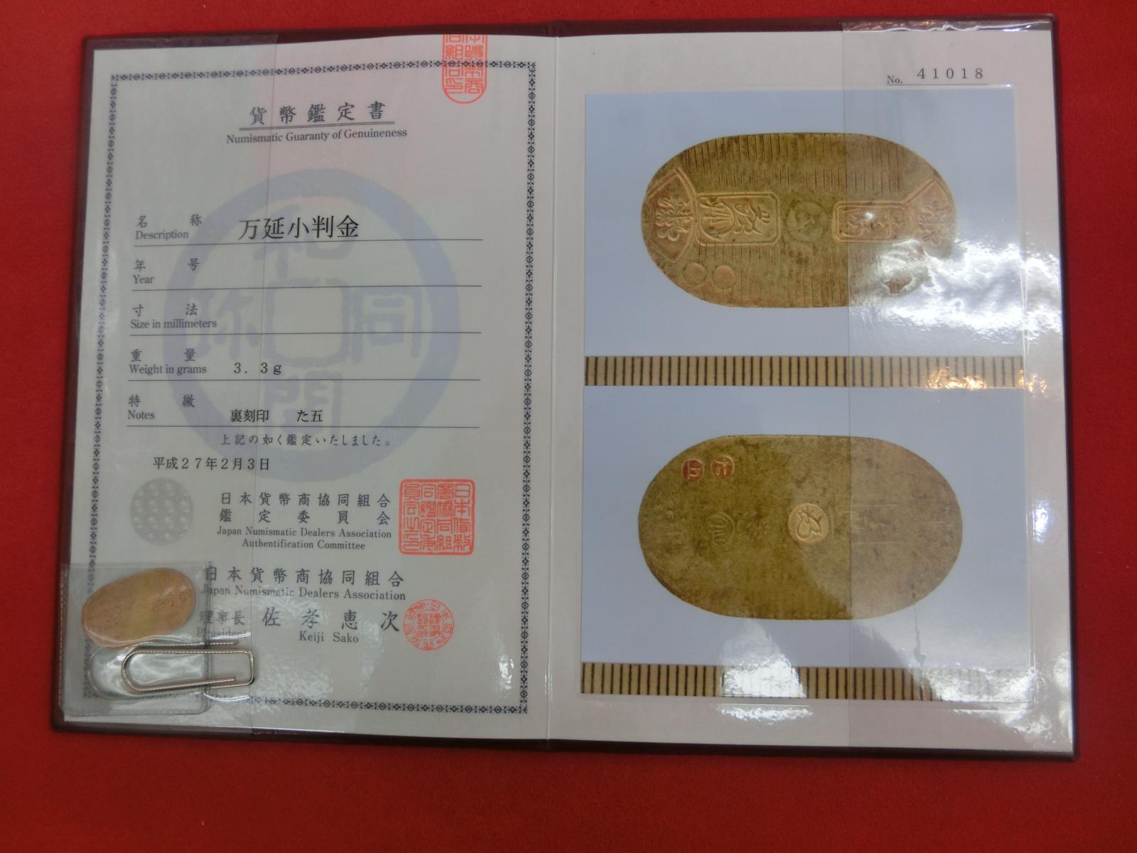 | 万延小判金 鑑定書付き ② | ||||