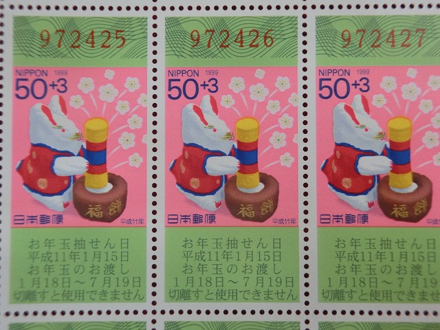 | 平成11年 50円 50枚シート くじ付き 佐原張子 餅つきうさぎ 年賀切手 | ||||
