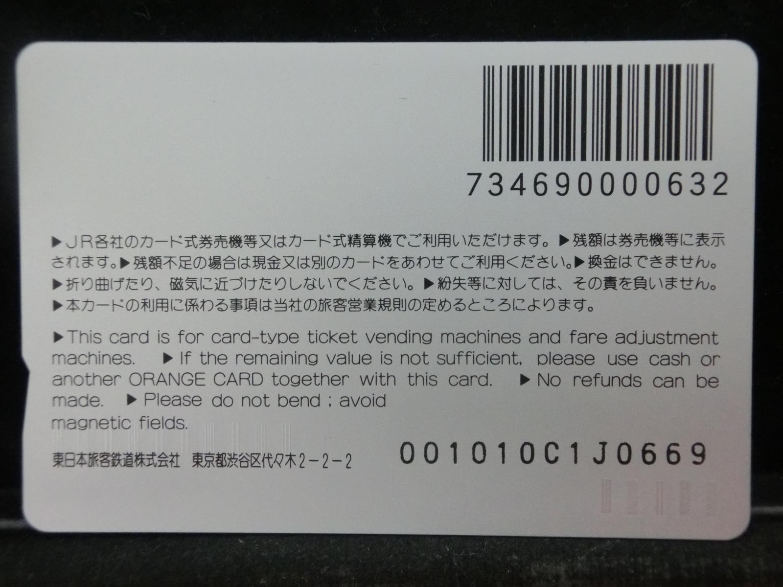 -----------------------商品説明-----------------------■品物 オレンジカード 未使用 ■額面 1000円 ■状態 画像をご確認ください。 ■在庫 在庫については、店舗販売もしておりますので、 ご注文頂いた全てをご用意できない場合もございます。 カートに在庫がない場合にもお問い合わせいただければご相談をお受けいたします。 ■オレンジカードとは JR各社で利用できる磁気式プリペイドカードである。略称でオレカとも呼ばれる。 日本国有鉄道(国鉄)時代の1985年3月25日に関東圏の主要駅で販売が開始されたのち、 全国で発売された。2013年3月31日限りで発売を終了した。 ◎概要 1971年(昭和46年)に研究と開発を開始。マルス105開発や国鉄経営難等もあって開発は数回中断している。 1984年(昭和59年)、JNRカードの開発と同時期に再度開発をスタート。 当時からICカード化にも意欲を見せていたが、この時は断念している。 開発プロジェクトのリーダーは、当初から須田寬(後に常務理事を経てJR東海の初代社長)が担当している。 オレンジカード対応の自動券売機で乗車券(切符)類の購入に利用できる。 また、オレンジカード対応の自動精算機や有人改札の窓口処理機で乗り越し精算にも利用できる。 もっとも、イオカード・Jスルーカード・ワイワイカード(以上いずれも発売終了)のように、 自動改札機に直接投入して自動精算することはできない。 JRの駅のみどりの窓口やカード発売機のほか、一部のデパートで購入することができた。 また、JRの一部特急列車でもオレンジカード発売の案内放送があれば車掌から購入することが可能で、 その中には車内販売限定オリジナルデザインのものもあった。 新幹線のみが停車する山陽新幹線の新神戸駅、北陸新幹線の安中榛名駅や 東北新幹線のいわて沼宮内駅・二戸駅・八戸駅・七戸十和田駅・東海道新幹線の新富士駅、 在来線の無人駅およびみどりの窓口非設置駅では、オレンジカード対応の自動券売機が設置されていないため、 オレンジカードを使用しての乗車券類の購入はできない。 ただし、新幹線のみが停車する軽井沢駅・上田駅・上毛高原駅や、一部のみどりの窓口非設置駅などでは、 オレンジカード対応の自動券売機が設置されている場合がある。 無人駅が多い鶴見線や青梅線の各駅にもオレンジカード対応の自動券売機が設置されていたが、 鶴見線は鶴見駅を除く全駅が2022年2月28日に、 青梅線は一部の駅を除き2017年から2018年にかけて自動券売機が撤去され、利用ができなくなった。 みどりの窓口設置駅でありながら他社管理駅である小諸駅(しなの鉄道管理駅)、 八戸駅(在来線は青い森鉄道管理駅)と自動券売機非設置の左沢駅などでは使用することができない。 オレンジカードで購入した乗車券類は、みどりの窓口[注 2]で乗車変更の取り扱いが可能である。 他の乗車カード類の場合も共通するが、 オレンジカードで他のオレンジカードや他のJRの磁気式乗車カード(イオカード)などを購入したり、 Suica・ICOCA・TOICA・Kitaca・SUGOCAのJRの 非接触型ICカードを購入したりチャージ(現金積み増し)したりすることはできない。 また車内精算で使用することもできない。 以前はクレジットカードでの購入も可能だったが、北海道旅客鉄道(JR北海道)では2003年6月20日から、 東日本旅客鉄道(JR東日本)では2005年ごろから(ビューカードは最後まで購入可能だった)、 JR九州、JR四国、JR西日本も段階的に購入が不可能となった。 これは、クレジットカードを盗んだ者がオレンジカードを購入、 金券ショップで換金することで現金を得るという不正行為を行っており、これを防ぐことが目的であった。 ◎発売終了 JR東日本の首都圏エリアでは1991年3月1日にイオカードが発売開始され、 そして2001年11月18日にSuicaの販売を開始した。 これらのカードは自動券売機で乗車券に引き換えることなくカード自体に対して 自動改札機による改札処理を行うことが可能でありオレンジカードに代わり普及し、 JR東日本ではオレンジカードの売上はピーク時の1991年には327億円あったが、 2006年には13億円に減少した。 また他のJR各社も1990年代以降、自社独自の磁気式ストアードフェアカードやICカードを発売開始している。 JR西日本(西日本旅客鉄道)では、新幹線単独駅に設置されている一部の券売機を除いてオレンジカードが使用可能であり、 在来線扱いの博多南線博多南駅でも使用できる。 ICOCA・Jスルーエリアの小規模の駅で取扱いをやめている。 一部の駅の出札窓口でも専用の処理機を使う事で利用することができた時期もある。 ただし、一部の駅ではオレンジカード対応券売機が設置されていない。 このため、オレンジカード対応の自動券売機が更新されないケースや、 オレンジカードを発売していない駅も出てきている。 しかし、当時ICOCAの導入予定を公式発表していなかった北陸地方と山口県内や山陰地方では、 2008年頃まで記念カードも発行されていた。 また、2011年頃でも、JR北海道[注 3]とJR四国[